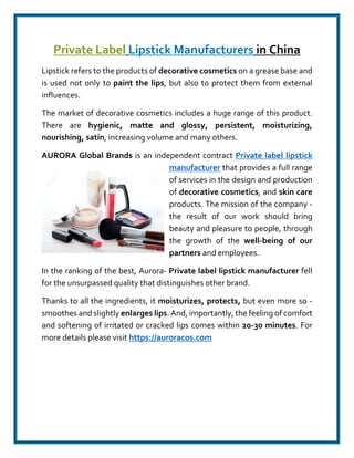 Private Label Lipstick Manufacturer Wholesale Supplier | Private Label ... Private Label Lipstick Biotech Co., Ltd. can offer you the special service that is to build your own brand logo dream to be come true, located in the Southern part of China, where it is rich in resources such as all cosmetic products, lipstick, lip gloss, makeup raw material, accessories. Our main products are liquid lipstick, lipgloss, eye ...