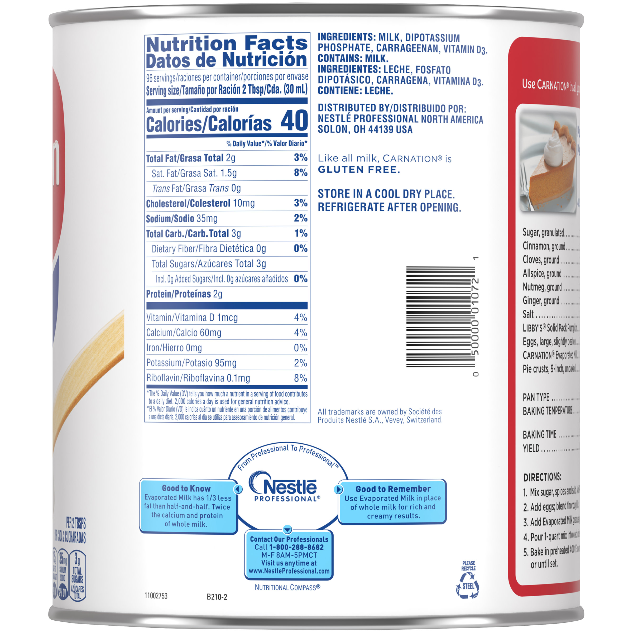 Carnation Evaporated Milk Nutritional Facts | livestrong One ounce of regular, reduced-fat or fat-free Carnation evaporated milk contains 2 grams of protein. Women need 46 grams of protein per day, so a one ounce serving of evaporated milk is 4 percent of that goal. Men should have 56 grams of protein each day, and one ounce portion of evaporated milk is about 3.5 percent of that recommendation. NESTLÉ® CARNATION® Sweetened Condensed Milk - Very Best Baking Sweetened Condensed Milk NESTLÉ® CARNATION® Sweetened Condensed Milk 14 oz Write a review WHERE TO BUY The key to baking rich and decadent recipes that taste their best. Made with real milk and sugar to add a creamy sweetness to desserts and baked goods. Perfect for baking, drizzling over fruit or ice cream, and sweetening beverages. NUTRITION Nestle Carnation Evaporated Milk - Shop Baking Ingredients at H-E-B Nestle Carnation Evaporated Milk. Use Carnation to add rich, creamy flavor to all your sweet and savory recipes. Gluten free. Pour, reclose and refrigerate! Refrigerate after opening. Use within 10 days after opening. Ingredients Milk, Dipotassium Phosphate, Carrageenan, Dextrose, Vitamin D3. Contains: milk. Nestle Carnation Evaporated Milk Allergy and Ingredient Information Nestle Carnation Evaporated Milk Nestle Carnation Evaporated Milk, UPC Code 050000010516 Manufactured by Nestle. Allergen Inside Helping You Shop & Eat Safer. Home; ... Nutrition Label. Nutrition Facts. Serving Size 2.00 tbsp. Amount Per Serving. Calories 40 Calories from Fat 20 % Daily Value* Total Fat 2g. 3.07%. Saturated Fat 1.5g. 7.5%.
