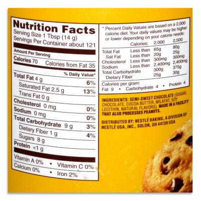 Calories in Nestle Toll House Chocolate Chips, Semi-sweet - Nutritional ... Comprehensive nutrition resource for Nestle Toll House Chocolate Chips, Semi-sweet. Learn about the number of calories and nutritional and diet information for Nestle Toll House Chocolate Chips, Semi-sweet. This is part of our comprehensive database of 40,000 foods including foods from hundreds of popular restaurants and thousands of brands.