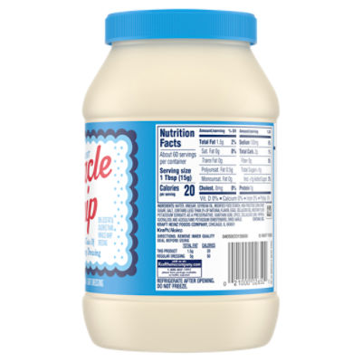 Miracle whip light nutrition facts. Amazon.com : Miracle Whip Light Dressing (12 ct Pack, 15 fl oz Jars ... Light Miracle Whip has cool, tangy flavor Miracle Whip dressing has a rich, creamy texture for easy spreading and dipping Contains 20 calories per serving New (2) from $13.82 FREE Shipping on orders over $25.00 shipped by Amazon. + This item: Miracle Whip Light Dressing (12 ct Pack, 15 fl oz Jars) $13.82 ($1.15/Count) Hy-Vee Aisles Online Grocery Shopping Miracle Whip Dressing: Total Fat (5 g); Calories (50). Kraftheinzcompany.com. Visit us at: Kraftheinzcompany.com.1-800-847-1997. Please have package available. Miracle Whip Light Dressing adds cool, zesty flavor to almost anything. Bursting with tangy vinegar and a medley of spices, this family favorite dressing and condiment delivers creamy ... Miracle Whip Light Mayo-like Dressing Jar, 30 fl oz - Walmart.com Our Light Miracle Whip contains fewer calories and fat than Kraft Mayonnaise. This product contains 20 calories and 1.5g fat per serving, Kraft Mayonnaise contains 90 calories and 10g fat per serving. Try light Miracle Whip for sandwiches and salads, in your favorite chicken recipe or as a creamy burger sauce. It also makes a tasty secret ... Kraft Miracle Whip Original Dressing - Shop Condiments at H-E-B Miracle Whip is half the fat and calories of mayonnaise. This product per serving: 3.5 G fat, 40 calories; Mayonnaise per serving: 10 G fat, 90 calories. Preparation instructions. Remove inner quality seal before using. Refrigerate after opening. Do not freeze. ... Kraft Miracle Whip Light Original Dressing, 15 oz. $4.90 each ($0.33/oz) Add to ...