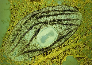 Chloroplast, TEM - Stock Image - C023/4053 - Science Photo Library AMI IMAGES / SCIENCE PHOTO LIBRARY Caption Chloroplast. Transmission electron micrograph (TEM) of a section through a chloroplast (bright green) in a cell from the shoot apex of a Coleus blumei plant. Chloroplasts are the site of photosynthesis in plants and algae. Release details Model release not required. Property release not required. Keywords