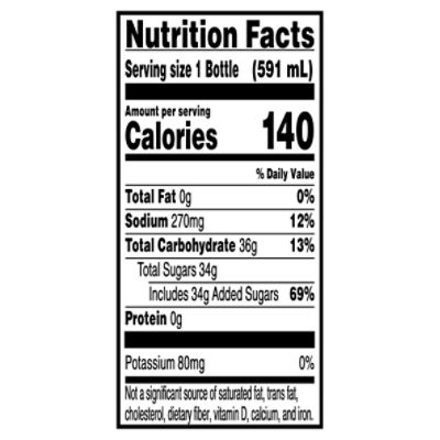 How Much Sugar Is in Gatorade? | livestrong A single 8-oz. serving of original Gatorade -- now called Gatorade Perform 02 -- contains 50 calories and gives you 14 g of sugar. As noted by the U.S. Food and Drug Administration, or FDA, there's no daily reference value established for sugar; the sugar content in original Gatorade goes toward its total carbohydrate content of 14 g, or 6 percent of your Daily Value, or DV. Gatorade Zero with Protein Fruit Punch Bottle A refreshing way to help kick start recovery. Nutrition & Ingredients Fruit Punch Serving Size: 1 Bottle (500 mL) Nutrition Facts Protein to kick start your recovery 10 g Protein 0 g Sugar Electrolytes to help replenish what you lose in sweat 230 mg Sodium 70 mg Potassium Related Products Gx Pod Multi-pack (3 packs, each with 4 pods) $21.00 Gatorade Thirst Quencher Sports Drink Cool Blue - 12 pk Water, Sugar, Dextrose, Citric Acid, Natural And Artificial Flavor, Salt, Sodium Citrate, Monopotassium Phosphate, Modified Food Starch, Glycerol Ester Of ...