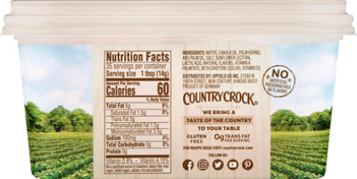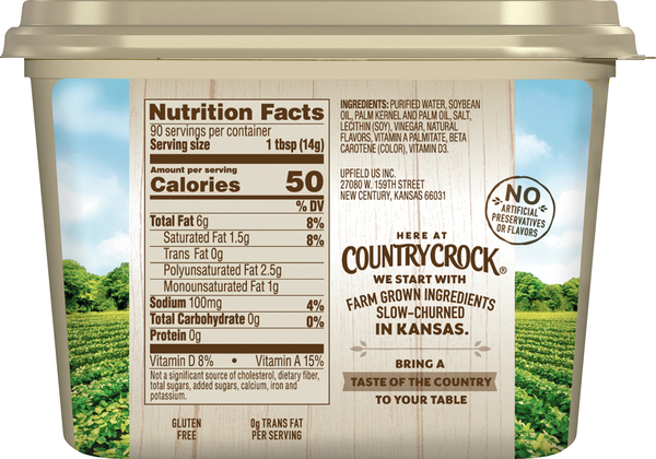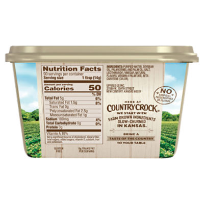 Country Crock Original Spread - Shop Butter & Margarine at H-E-B Ingredients Purified Water, Soybean Oil, Palm Kernel and Palm Oil, Salt, Lecithin (Soy), Vinegar, Natural Flavors, Vitamin A Palmitate, Beta Carotene (Color), ... Country crock, original, 40% vegetable oil spread by Lipton Country crock, original, 40% vegetable oil spread by Lipton ; Saturated Fat 1.5g, 8 % ; Sodium 100mg, 4 % ; Total Carbohydrate 0g, 0 %. Calories in Country Crock Plant Butter - ReciPal Nutrition facts label and information for Country Crock Plant Butter - Per 100 grams: 714.286 calories, 78.571g fat, 0.0g carbohydrate, 0.0g protein.