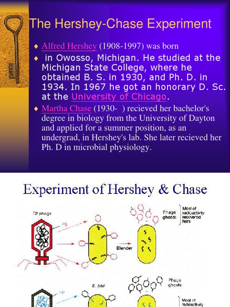 PDF The Hershey-Chase Blender Experiment - Molecular and Cell Biology The Hershey-Chase Blender Experiment ¥ a simple and classic experiment! ¥ performed by Alfred Hershey and Martha Chase at Cold Spring Harbor ... ¥ using Escherichia coli (E. coli) bacteria and T-group bacteriophages (phages or bacterial viruses) ¥ cultures of E. coli were grown in media that contained as the only source of sulfur ... Classic experiments: DNA as the genetic material The Hershey-Chase experiments In their now-legendary experiments, Hershey and Chase studied bacteriophage, or viruses that attack bacteria. The phages they used were simple particles composed of protein and DNA, with the outer structures made of protein and the inner core consisting of DNA.