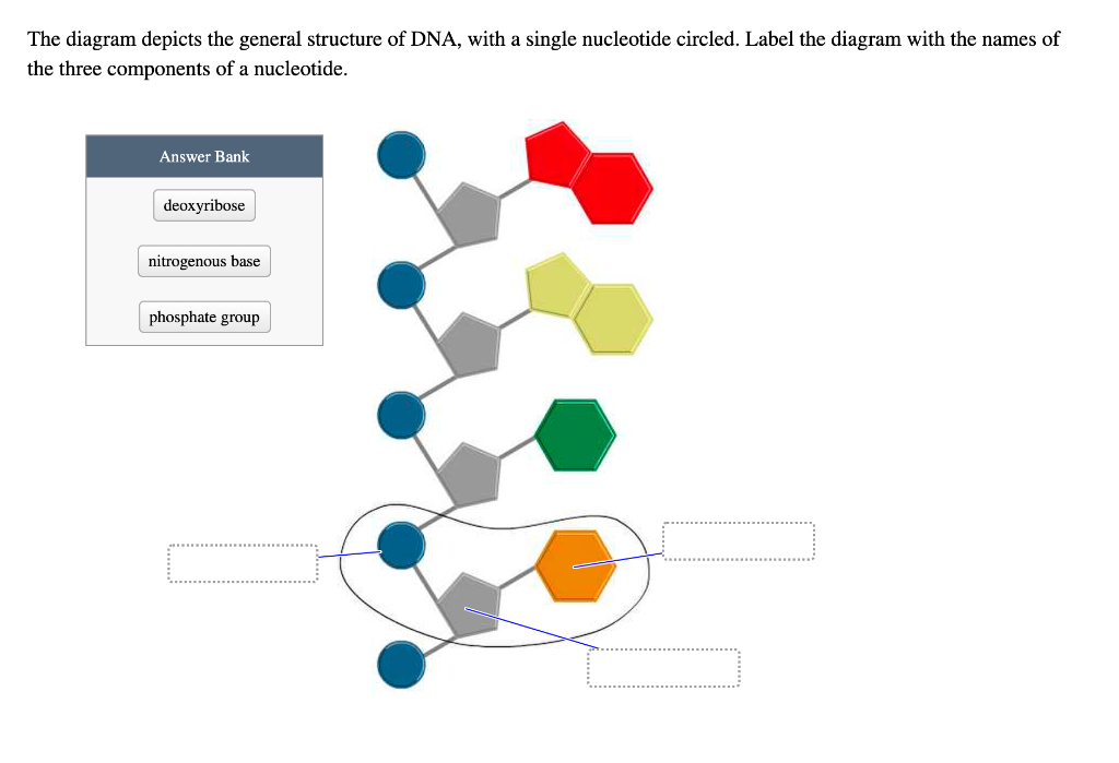 Label the diagram of dna nucleotides and bases. Solved Label the diagram. Use these choices nucleotide, - Chegg Question: Label the diagram. Use these choices nucleotide, deoxyribose, phosphate group, nitrogen base, hydrogen bonds, base pair. Complete each statement 7. guanine (C) cytosin (C) and thymine (1) are the four in DNA 8. In DNA always Soms hydrogen bonds with guaninc ). 9. Structure of DNA - Higher Biology Revision - BBC Bitesize Its structure is described as a double-stranded helix held together by complementary base pairs. The basic units of DNA are nucleotides. These nucleotides consist of a deoxyribose sugar, phosphate ... Nucleotide - Wikipedia Nucleotides are composed of three subunit molecules: a nucleobase, a five-carbon sugar ( ribose or deoxyribose ), and a phosphate group consisting of one to three phosphates. The four nucleobases in DNA are guanine, adenine, cytosine and thymine; in RNA, uracil is used in place of thymine. 3 Parts of a Nucleotide and How They Are Connected - ThoughtCo Both deoxyribonucleic acid (DNA) and ribonucleic acid (RNA) are made up of nucleotides which consist of three parts: Nitrogenous Base Purines and pyrimidines are the two categories of nitrogenous bases. Adenine and guanine are purines. Cytosine, thymine, and uracil are pyrimidines.