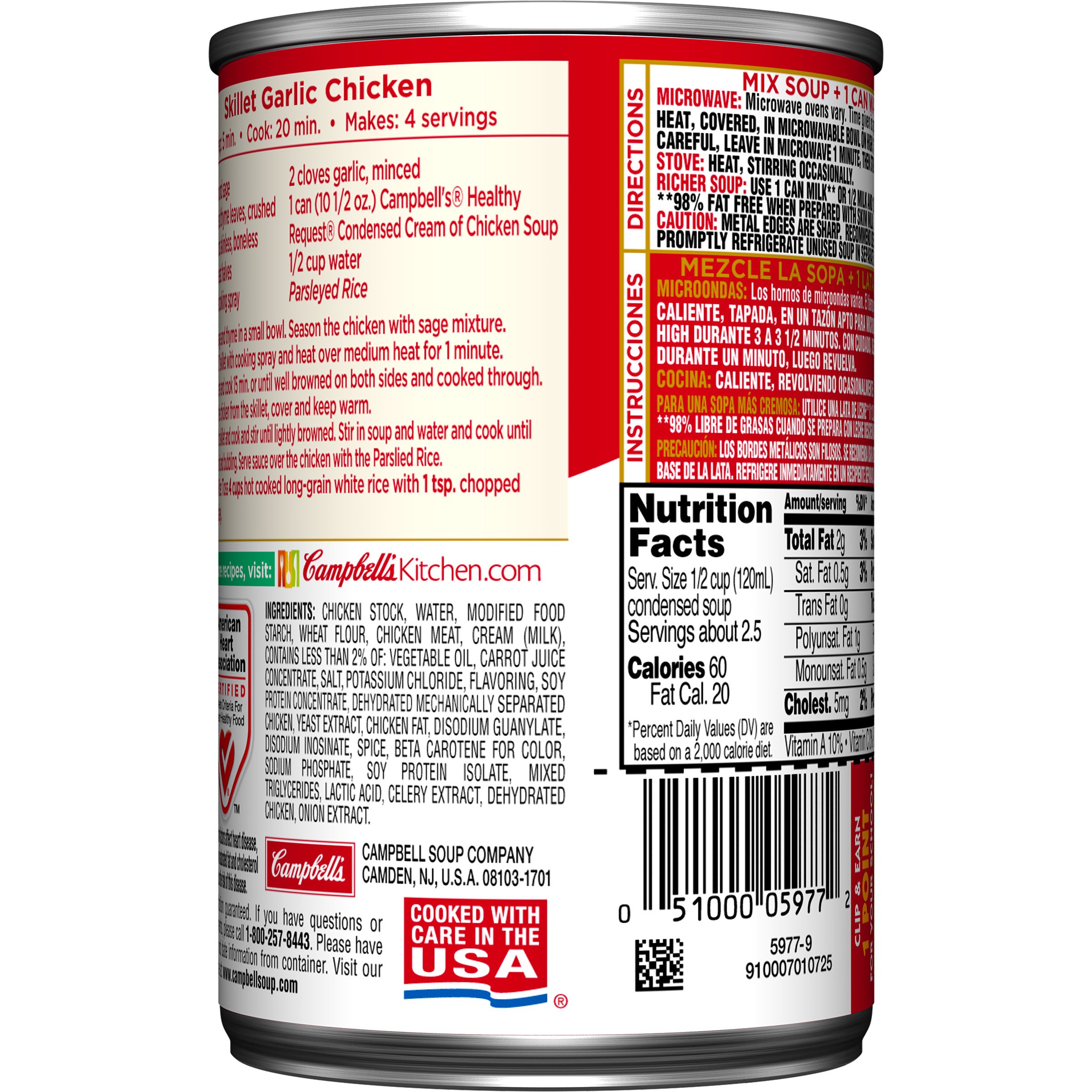 Campbell's cream of chicken soup label. Campbell’s® Classic Condensed Healthy Request Cream of ... See full list on campbellsfoodservice.com Campbell’s® Classic Condensed Cream of Chicken Soup Ingredients CHICKEN STOCK, WATER, VEGETABLE OIL, MODIFIED FOOD STARCH, WHEAT FLOUR, CREAM (MILK), CONTAINS LESS THAN 2% OF: SALT, CHICKEN*, SOY PROTEIN CONCENTRATE, CHICKEN FAT, YEAST EXTRACT, BETA CAROTENE (FOR COLOR), CHICKEN BROTH*, FLAVORING, CANE SUGAR, ONIONS*, CORNSTARCH, CELERY EXTRACT, ONION EXTRACT, XANTHAN GUM. *DRIED.